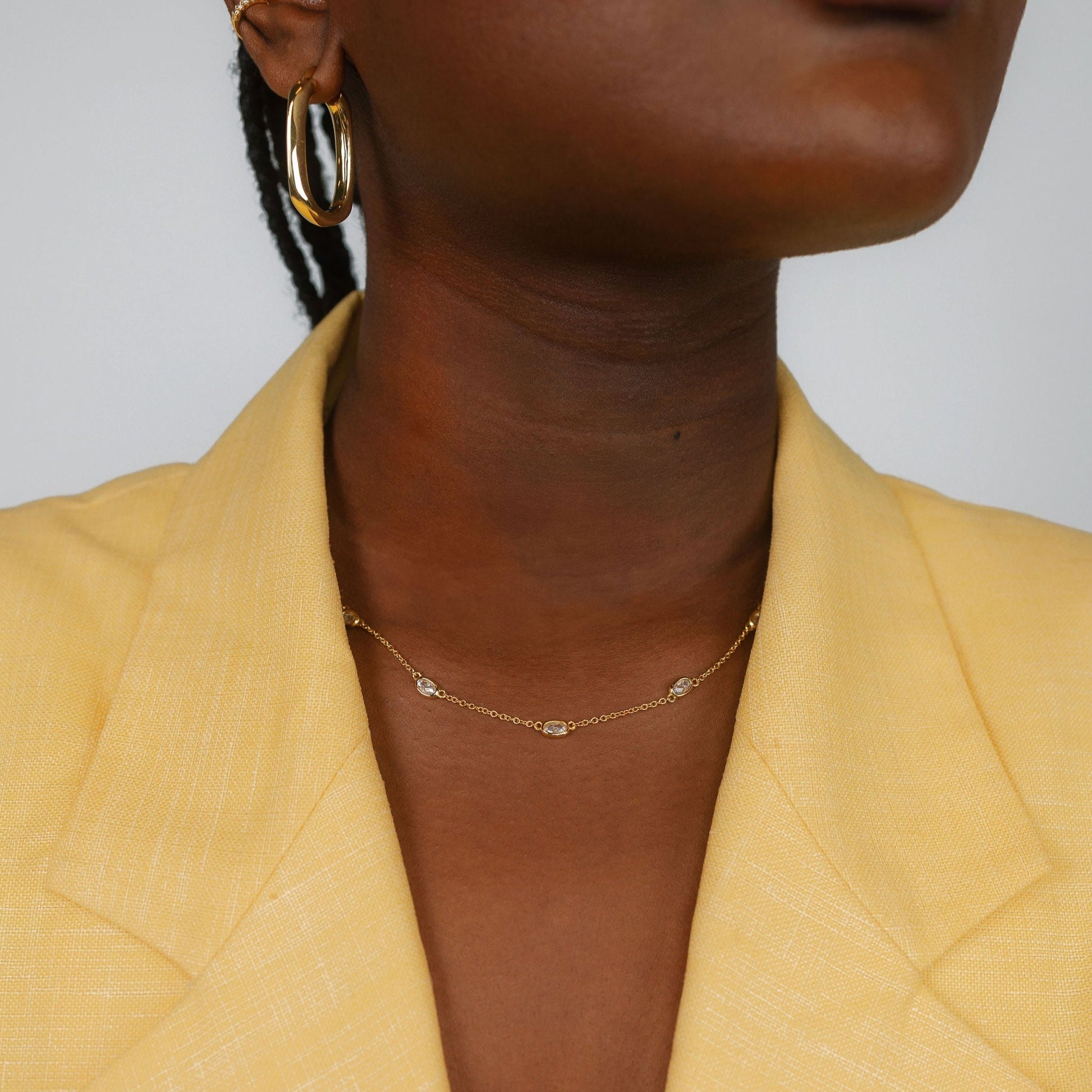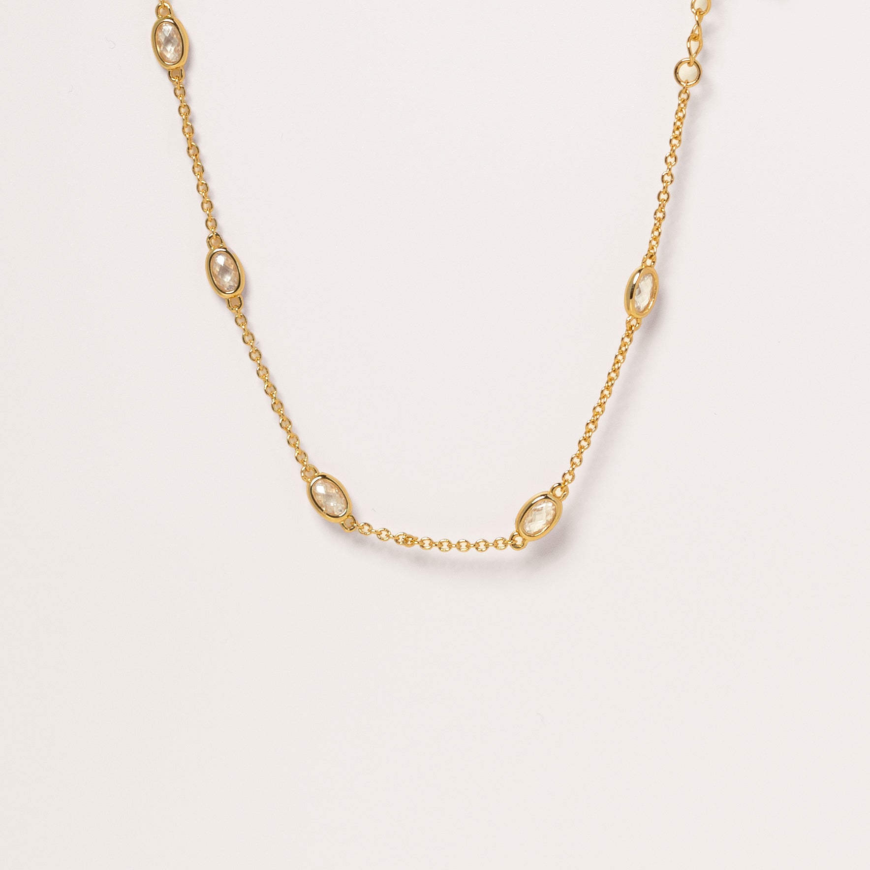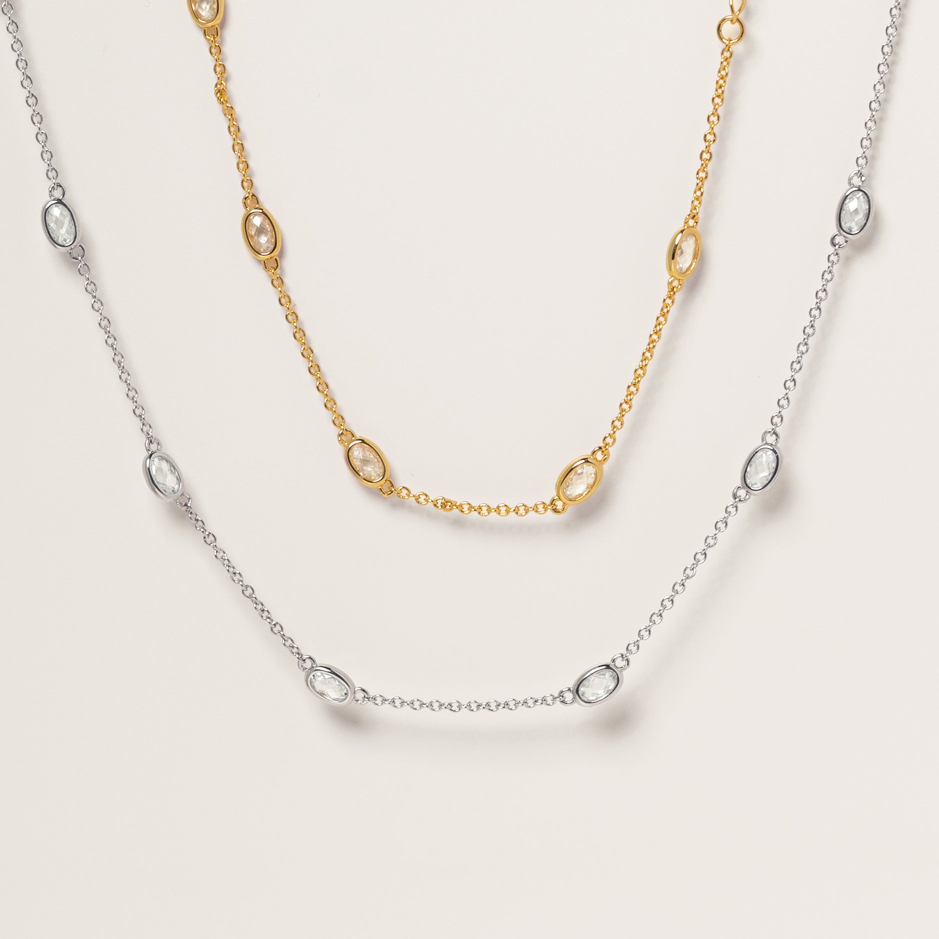 The Clara Necklace is a chic and darling necklace that can be worn on its own or added to a stack for some texture and sparkle. This necklace features bezel set oval CZ gems stationed an inch apart on a dainty cable chain. The 2" extender is perfect for layering with other favs like the Kim Cross or Riley Chain. The Clara Necklace is sure to be your newest layering obsession!