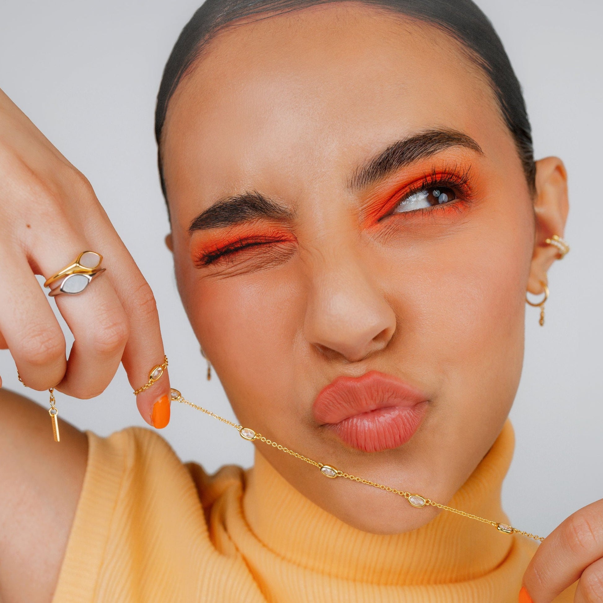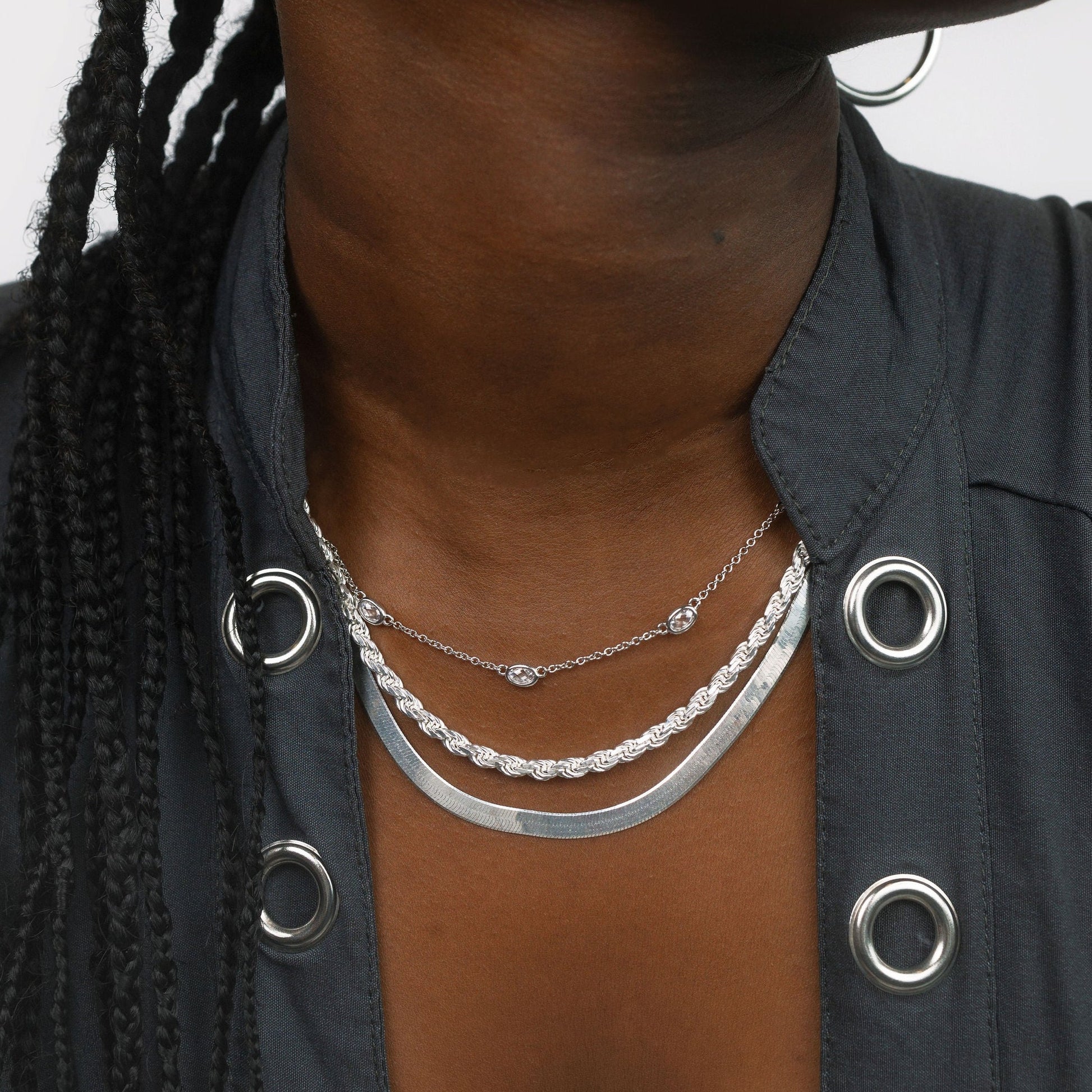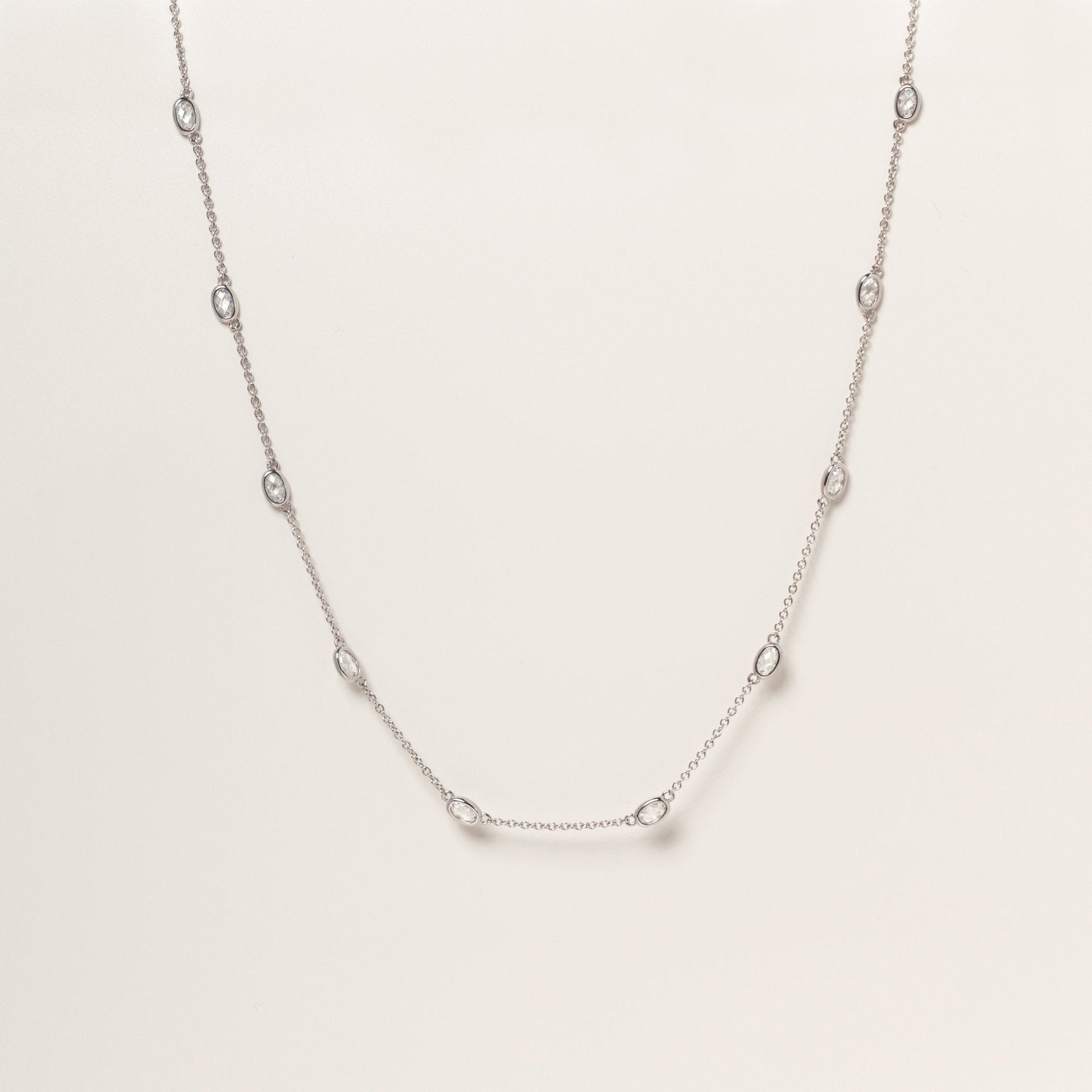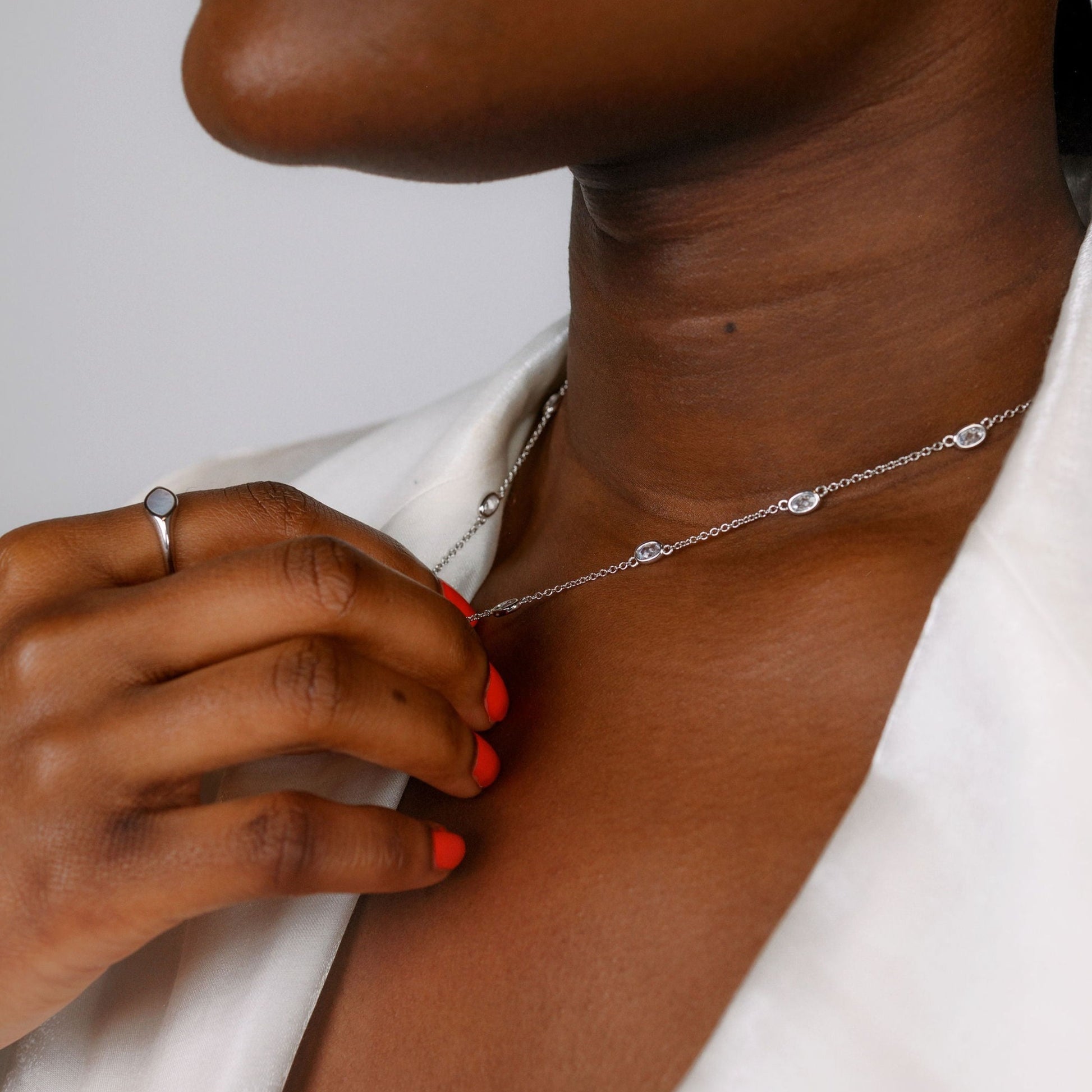 The Clara Necklace is a chic and darling necklace that can be worn on its own or added to a stack for some texture and sparkle. This necklace features bezel set oval CZ gems stationed an inch apart on a dainty cable chain. The 2" extender is perfect for layering with other favs like the Kim Cross or Riley Chain. The Clara Necklace is sure to be your newest layering obsession!